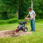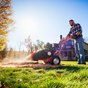 Position the DR Stump Grinder over the stump, engage one of the wheel brakes to lock a single wheel in place before engaging the cutting head and pivoting over the stump from side to side, shaving off an inch or so of material with each pass. Reposition the machine as needed to continue removing material until the entire stump is reduced to a pile of wood chips.
